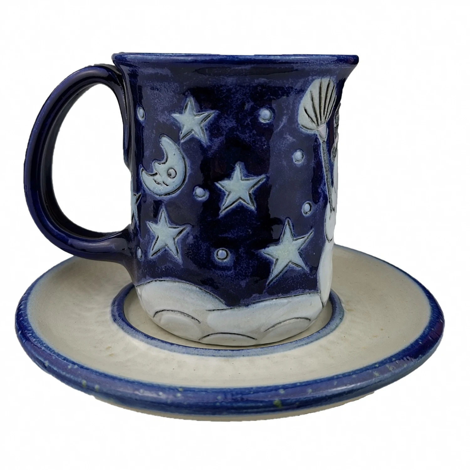 The artist scratches the winter motifs into the still damp shards with a wooden stick and then colored them by hand. The cobalt blue background and the enamel painting with white engobe create a wonderful contrast that harmoniously rounds off the winter scenery.