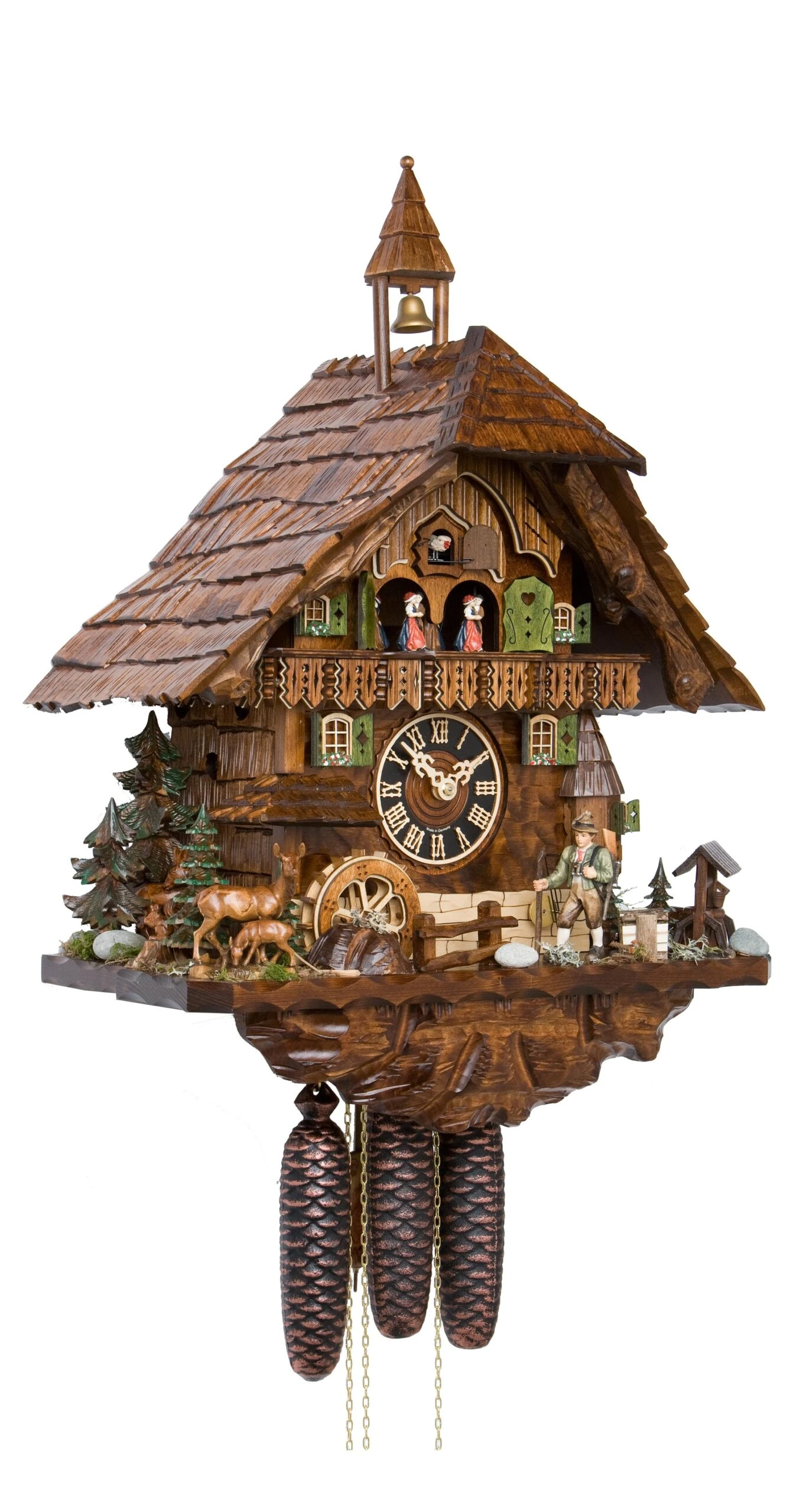 Cuckoo ClockBlack Forest House With Forest Scene And Moving Hunter And Turning Mill-wheel
