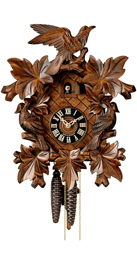 The cuckoo calls every half hour once and the number of the hours every full hour. This cuckoo clock has an exclusive life-like wooden handpainted cuckoo.