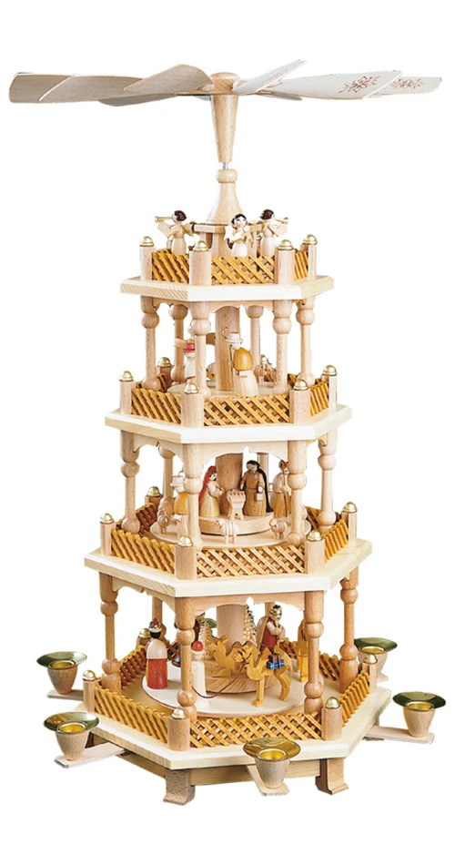 German Christmas Pyramid Nativity Scene, 3-tier, Height 54 Cm / 21 Inch, Natural, Original Erzgebirge By Richard Glaesser Seiffen